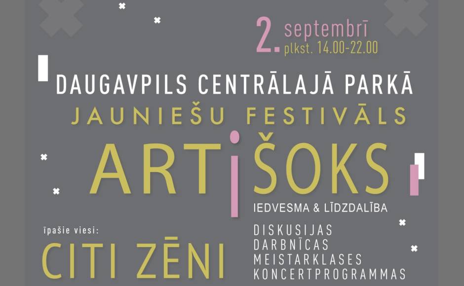 2 сентября в Даугавпилсе пройдет молодежный фестиваль ARTIŠOKS 2022: ВДОХНОВЕНИЕ & СОУЧАСТИЕ. Главным местом проведения фестиваля в этом году станет Центральный парк и посетители смогут принять участие в различных практических занятиях, мастер-классах, дискуссиях, спортивных мероприятиях, а также насладиться музыкальной программой. Фестиваль завершится концертом группы "Citi Zēni".